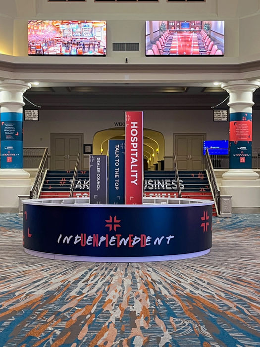 At-event, the opening reception included a Shaw Turf & Football Party, arranged stadium-style with raked seating and featuring the client’s own artificial grass product. This was turned overnight into a general session space with video mapped floor projection. Other features included extensive environmental branding, sales raffles, and a live broadcast studio.
